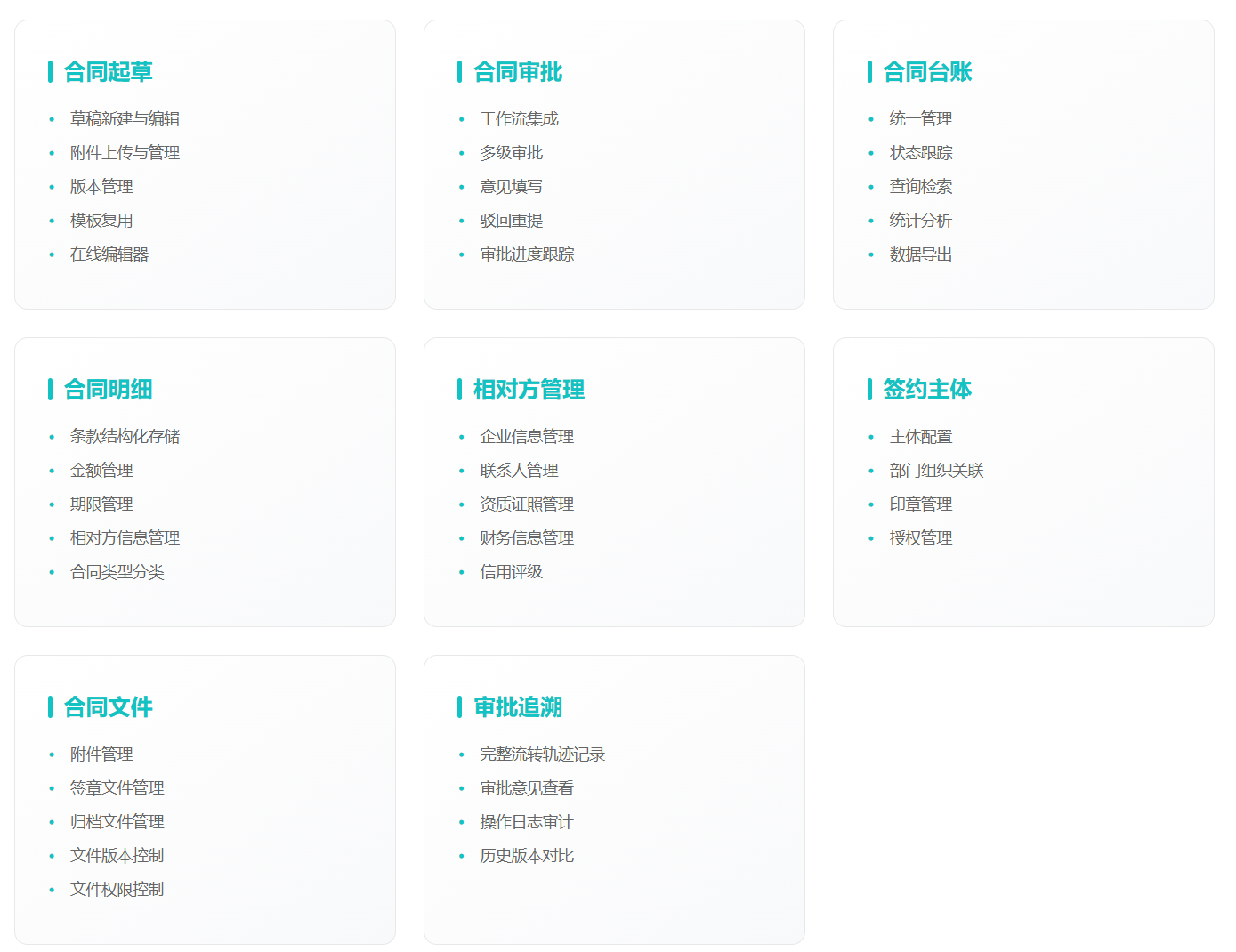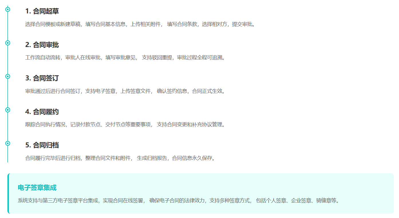 支持合同起草、审批、台账管理、版本控制,与工作流引擎集成,支持电子签章文件管理,实现合同状态全流程跟踪